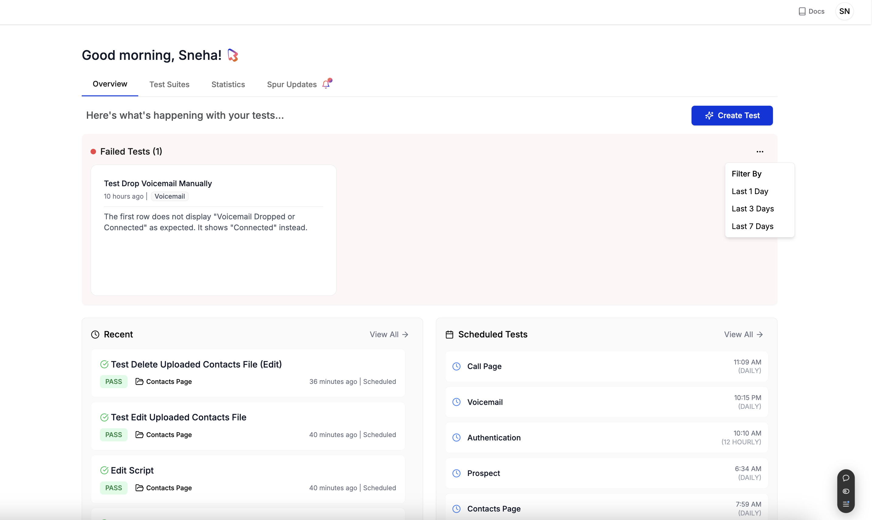 The dashboard provides a comprehensive view of your test results with flexible filtering options:- View all recent test failures at a glance