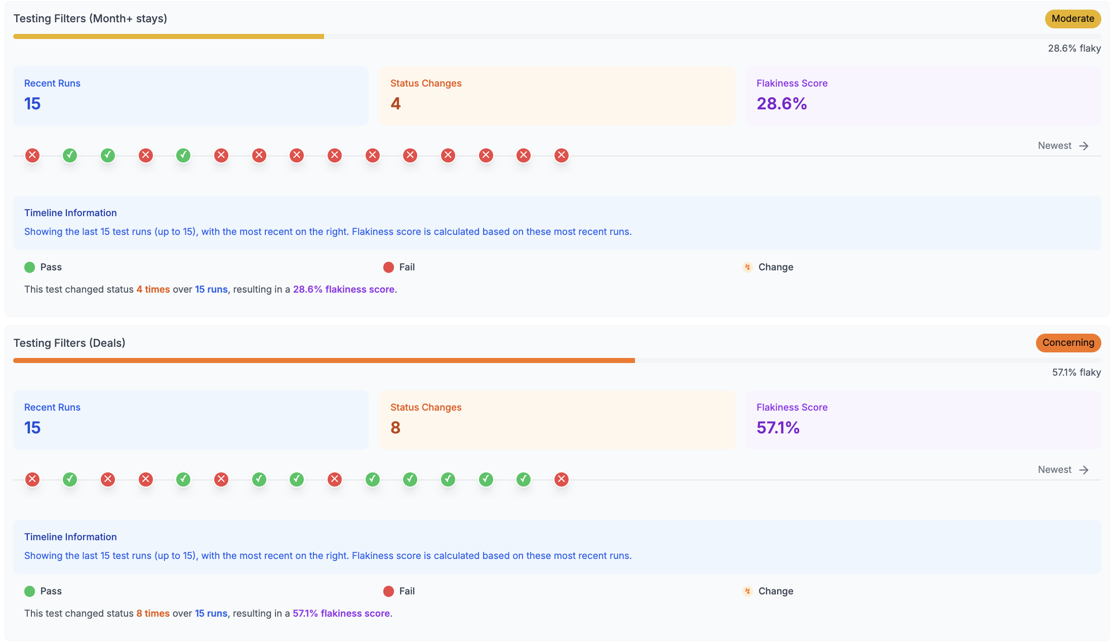 - Test B: Pass, Pass, Pass → No fluctuations. (not flaky)