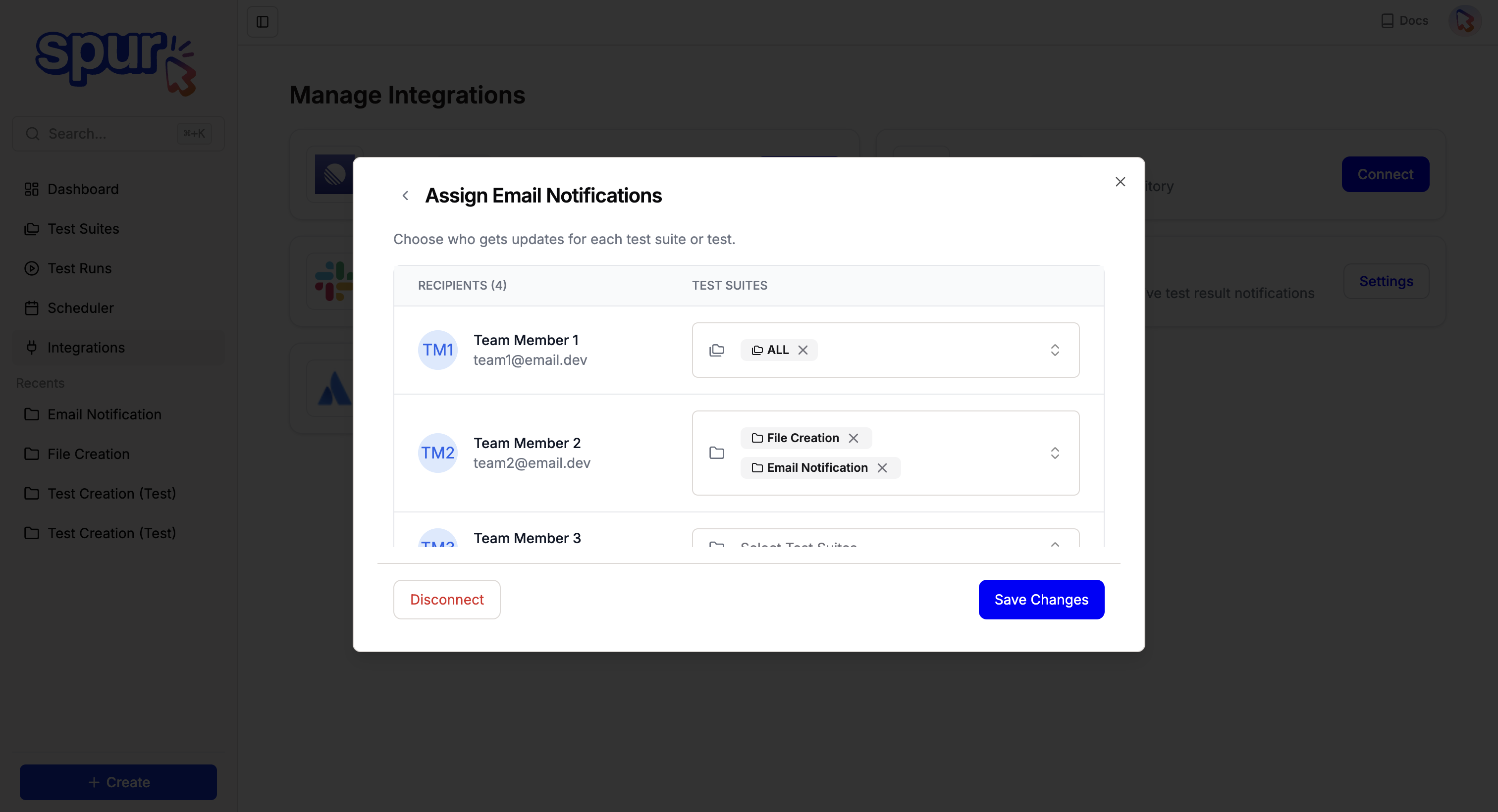 Choose which emails to send issues to and configure your preferences:Configuration Options:- All failing tests