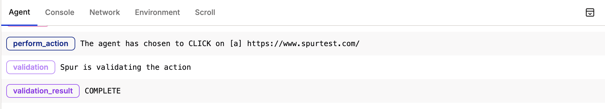 View Spursor’s thought process when evaluating and executing test steps.