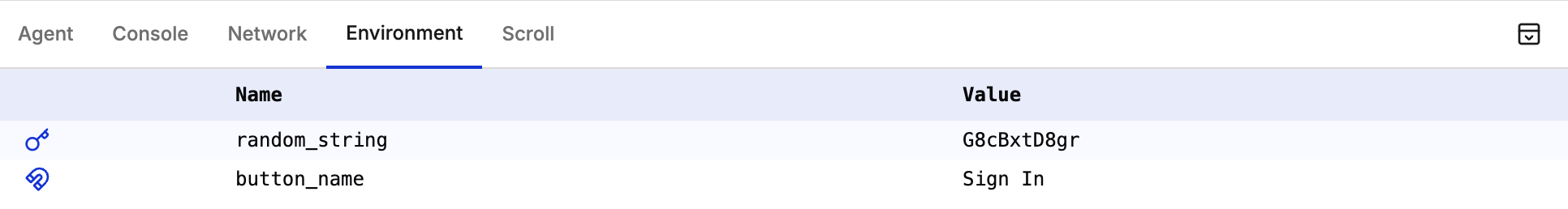 View extracted or generated values that are saved in the testing environment. These values can be accessed and used in subsequent test steps.
