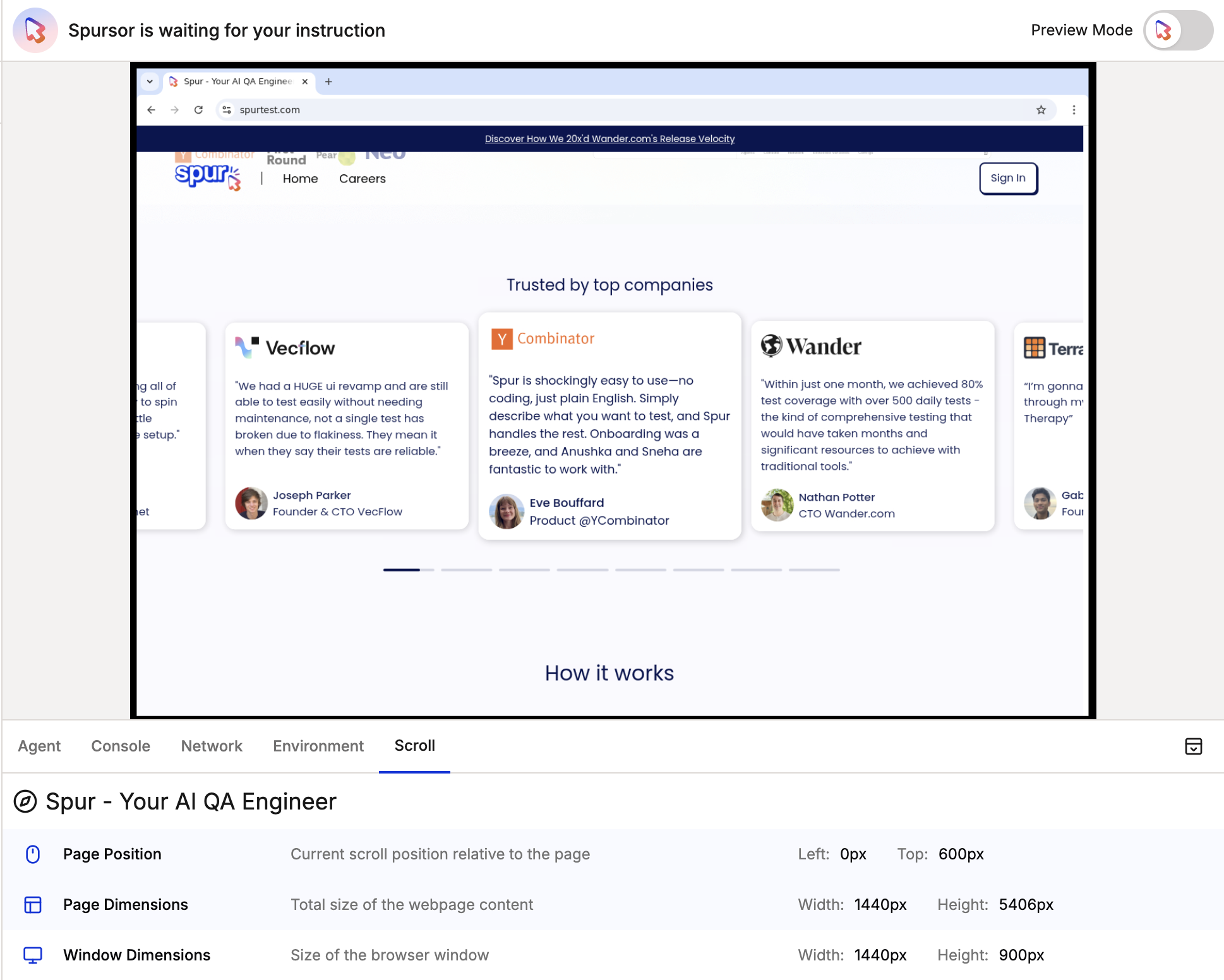 Preview Mode allows users to preview Spursor’s next action on the website, then will provide options for the user to approve or decline the action. When turned off, Spursor will execute its action without approval.