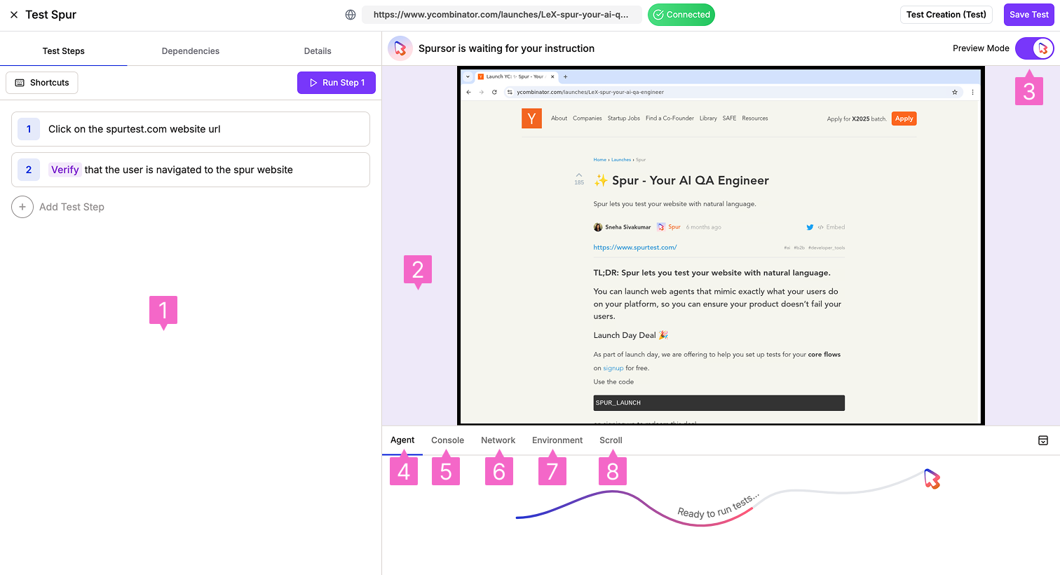 Watch test runs get executed by Spursor (Spur’s AI agent) in real-time.