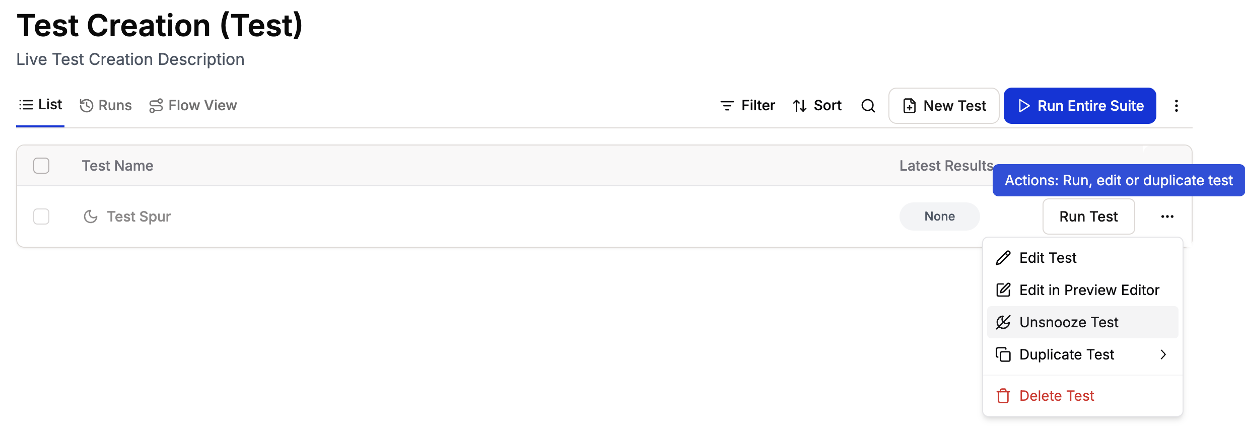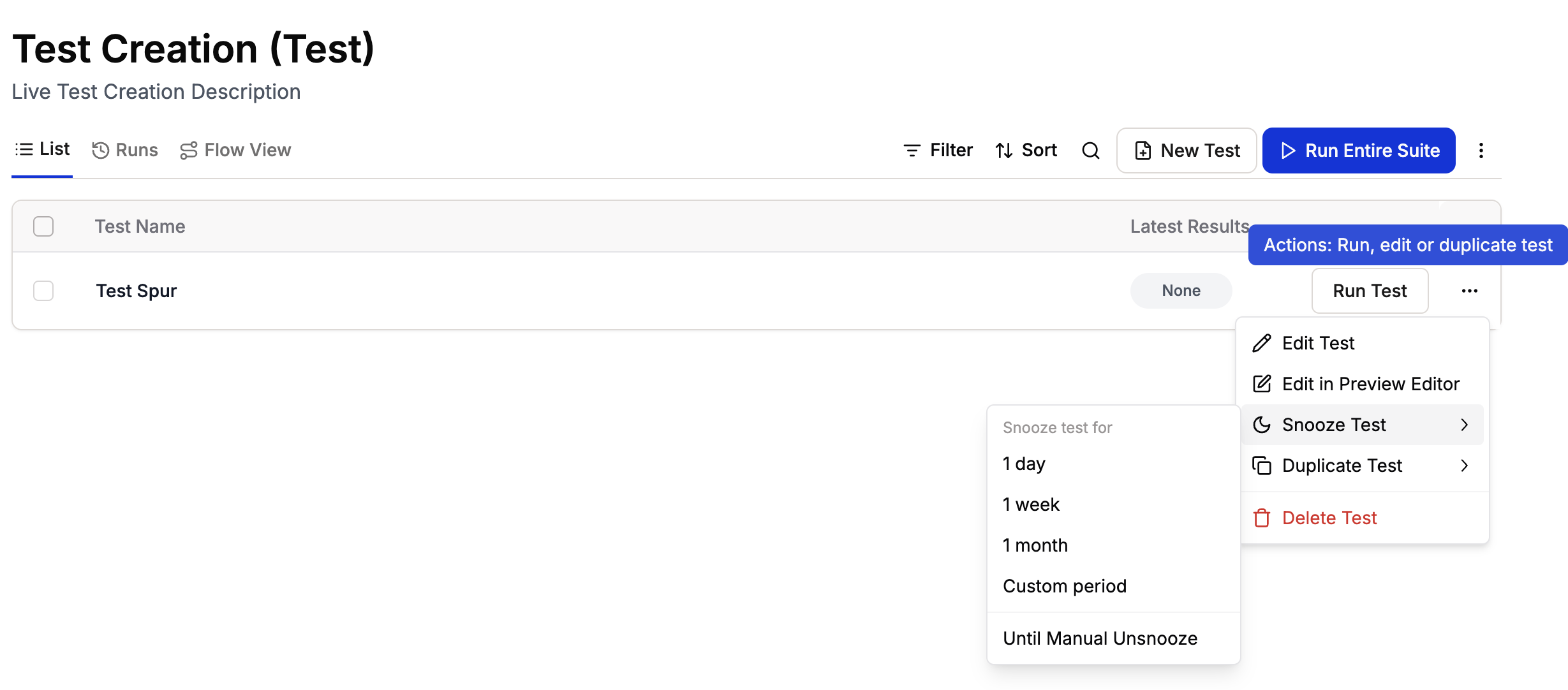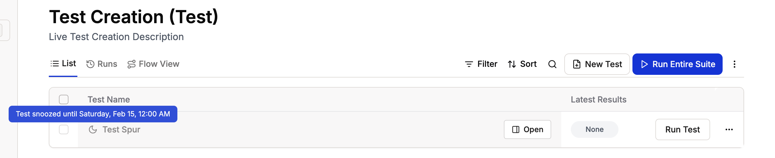You can temporarily mute tests until a selected period. When snoozing a test, any dependencies will also be automatically snoozed during batch runs, helping you manage test execution more effectively.How to snooze tests