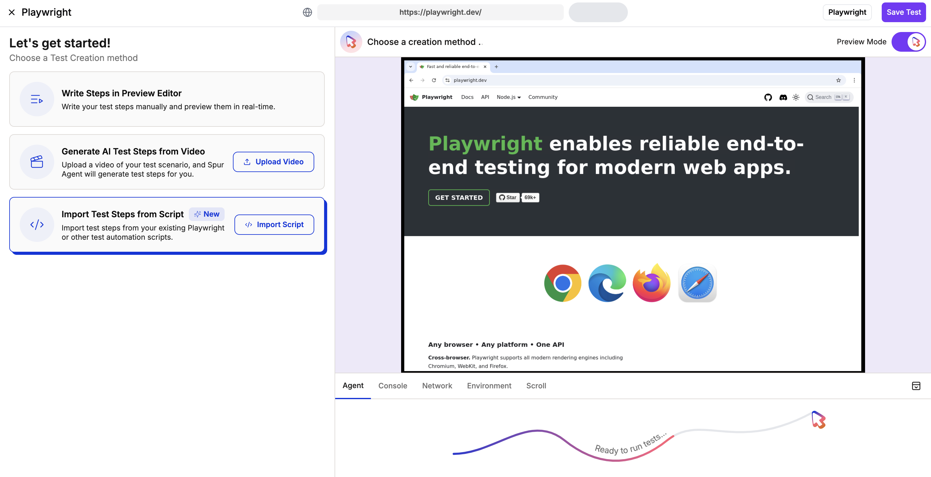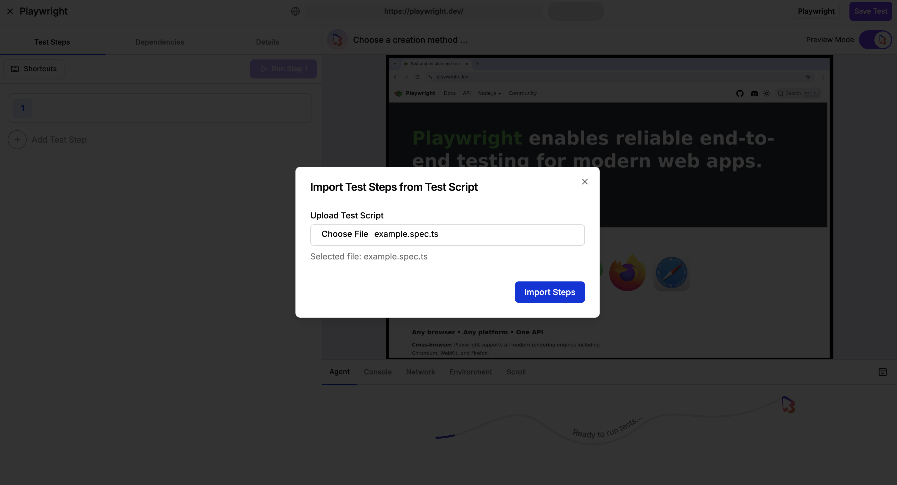 Begin by choosing “Import Test Steps from Script” in preview mode, or in the side-navigation view