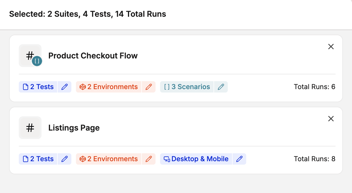 A Test Plan is a collection of test suites run together, each with saved configurations:- Cross-Environment - Choose which environments each suite runs on
